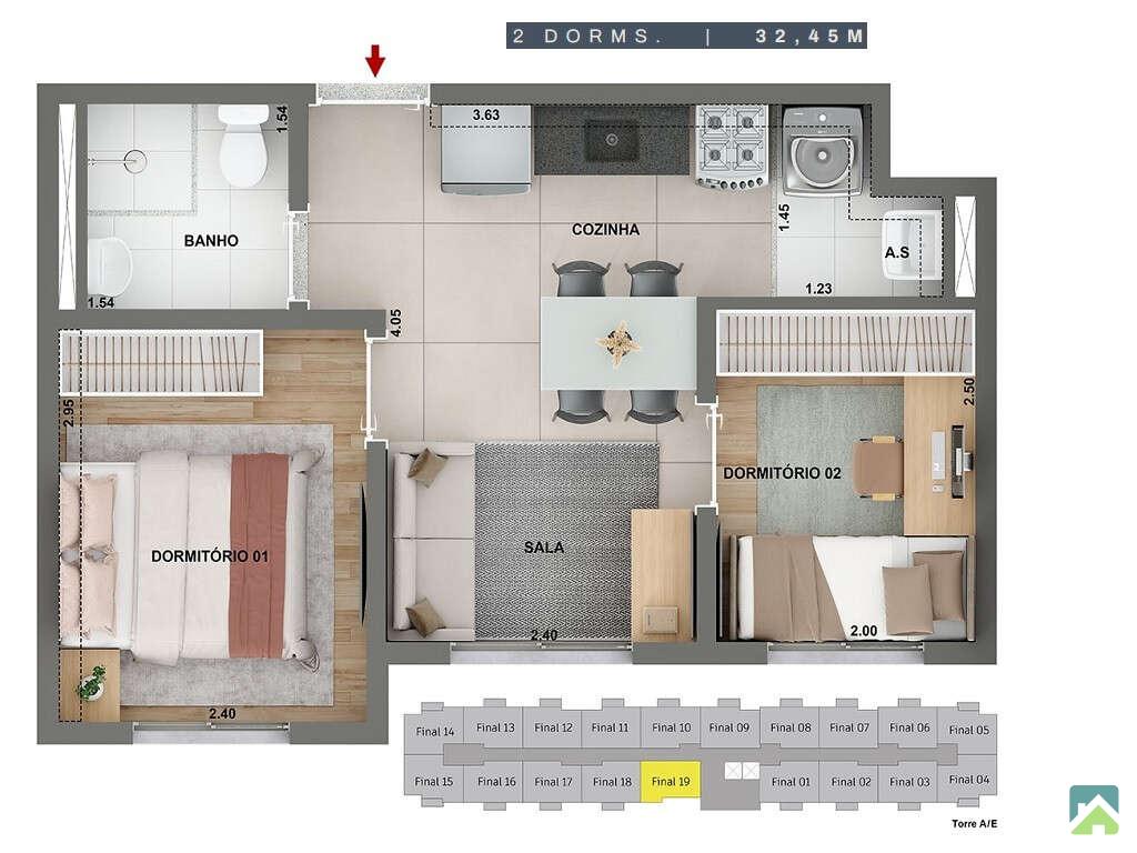 Apartamento de 2 dormitórios, com planta otimizada, ideal para morar ou investir, em condomínio moderno, lazer completo e excelente custo-benefício.
