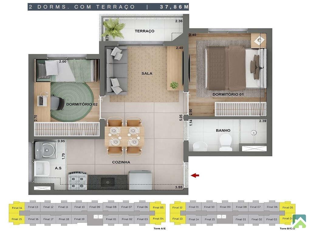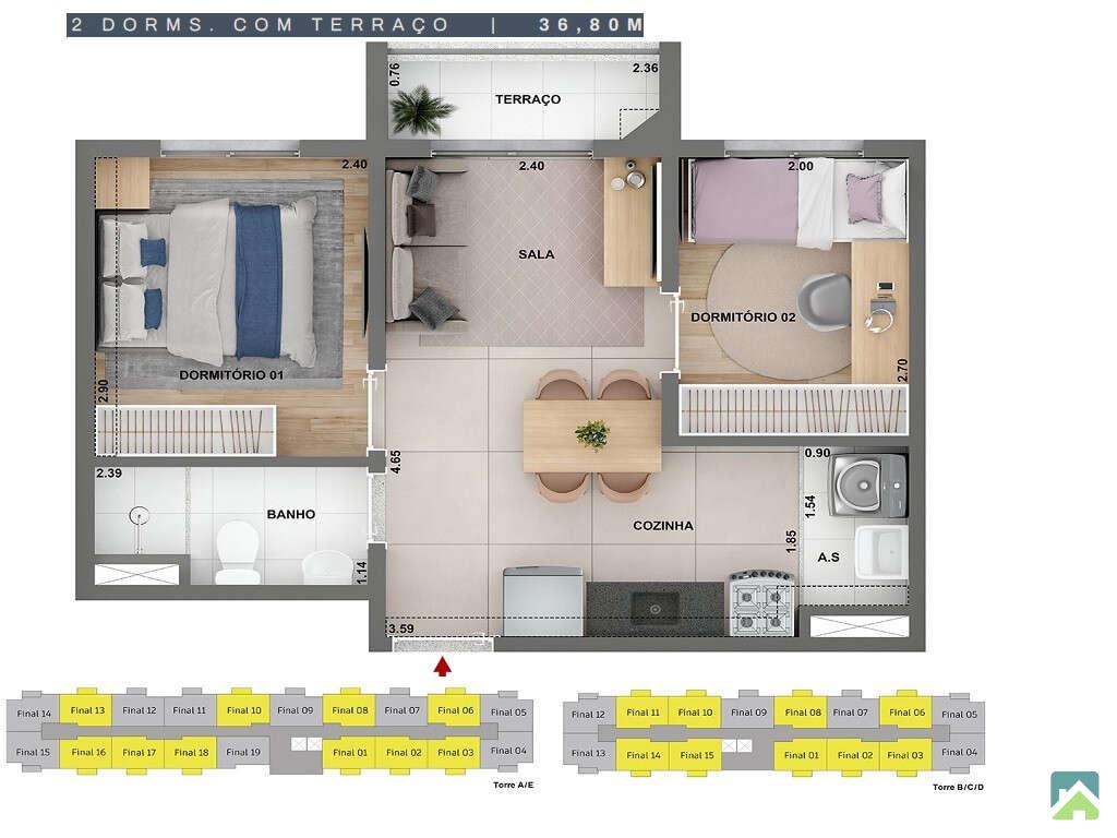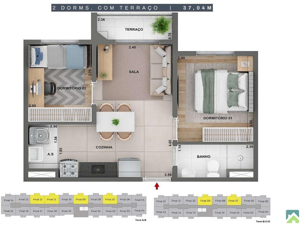 Apartamento com 2 dormitórios, planta versatil, sala para 2 ambientes, banheiro social, cozinha tipo americana e área de serviço.