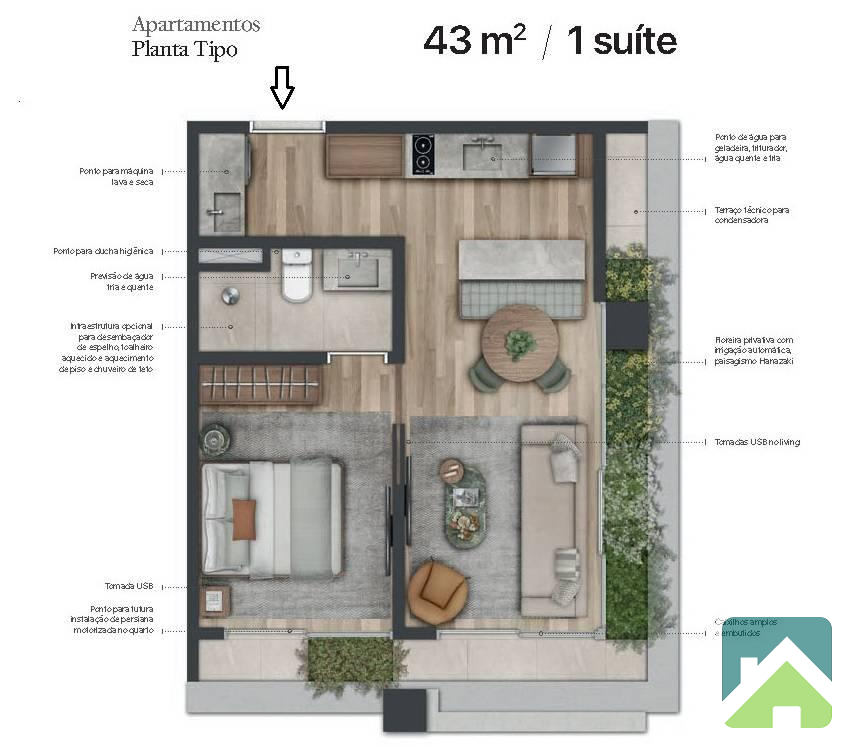 O imóvel com 43m², 1 Suite, Living e Cozinha integrada, Terraços Sala e Dormitório.