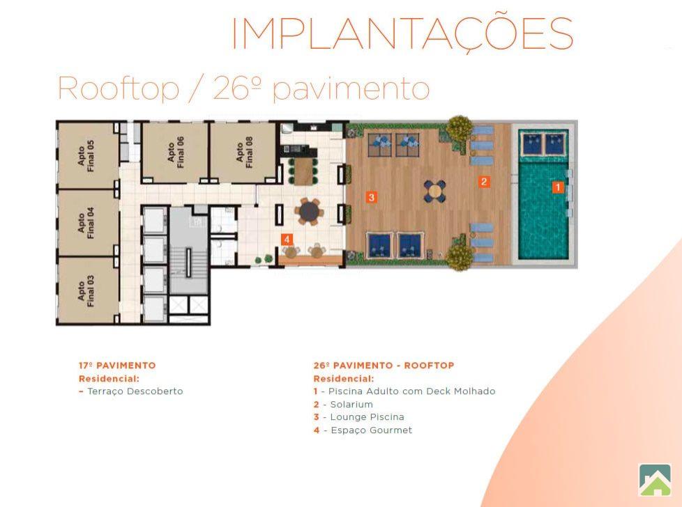 Áreas comuns entregues equipadas e decoradas: Bosque, Salão de festas com terraço, Praça do Fogo com lazer descoberto, Home cinema, Fitness coberto e descoberto, Brinquedoteca, Sala de jogos, Espaço Gourmet, Piscina adulto com deck molhado, solarium e lounge.