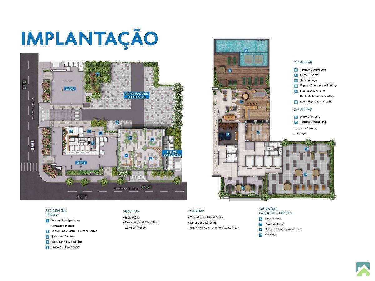 Áreas de Lazer: Salão de Festas, Salão Gourmet, Fitness, Home Cinema, Piscina Adulto com Deck Molhado e Solarium no Rooftop, Sala de Yoga, Pet Place, Fitness Outdoor; Skylounge, Playground, Espaço Teen, Praça do Fogo.