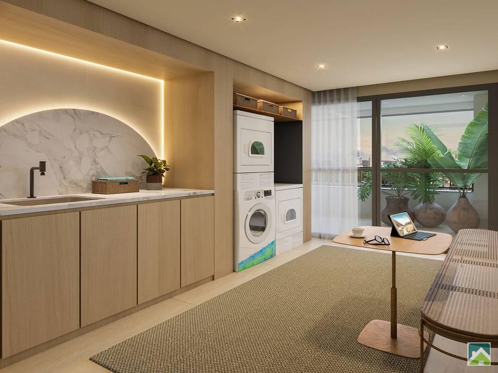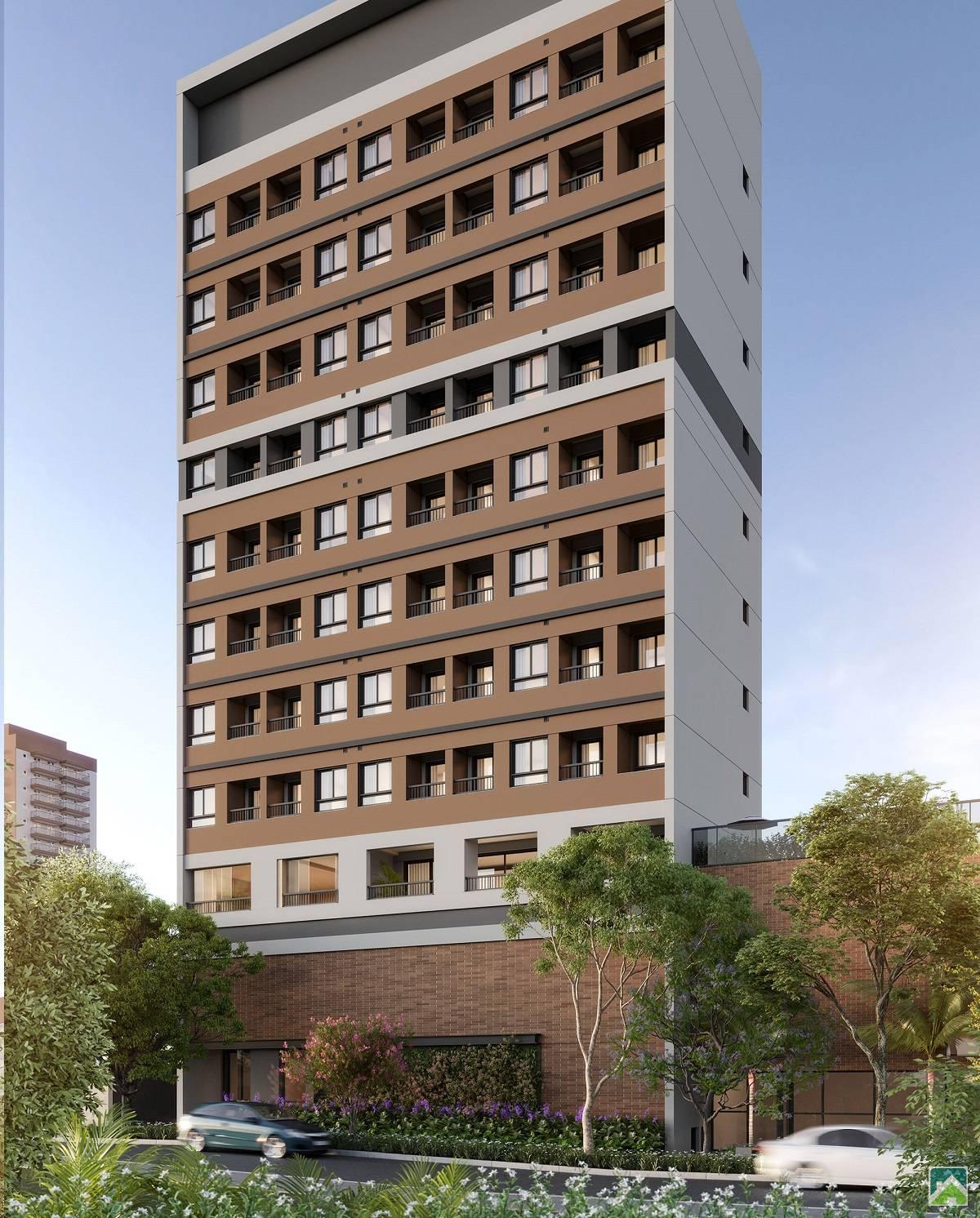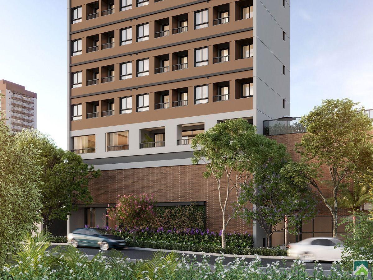 Apartamento Studio com 1 dormitorio e terraço, sala, banheiro social, cozinha e serviço. Unidades de 32m², Infra para ar condicionado. Vista Livre.