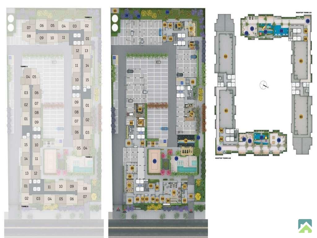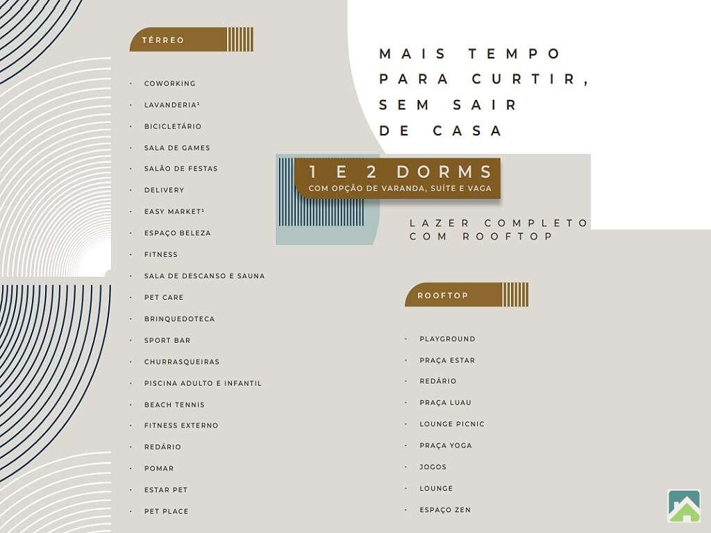 Piscina adulto e infantil, salão de festas, churrasqueira, brinquedoteca, coworking, espaço beleza, fitness, espaço gourmet, pet care, sala de descanso e sauna, sport bar, academia e fitness externo, apoio gourmet, bicicletário, pet place, playground, praça de acesso, praça fitness e solário.
