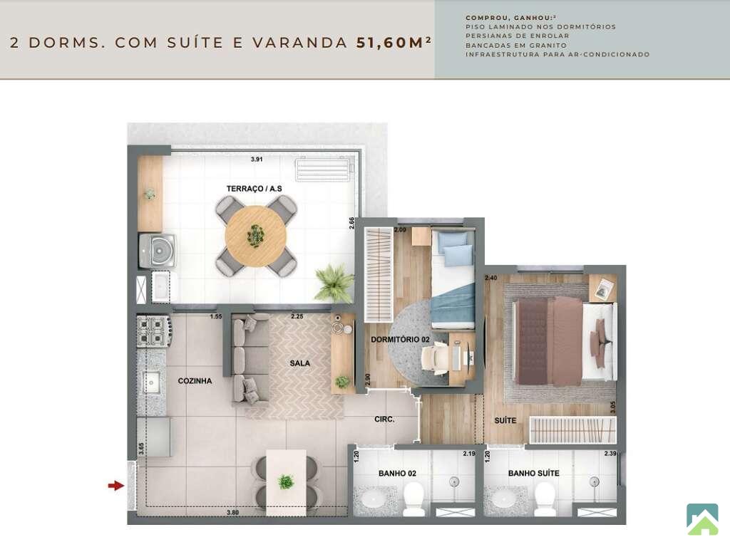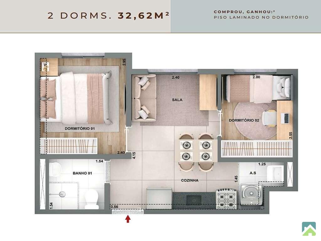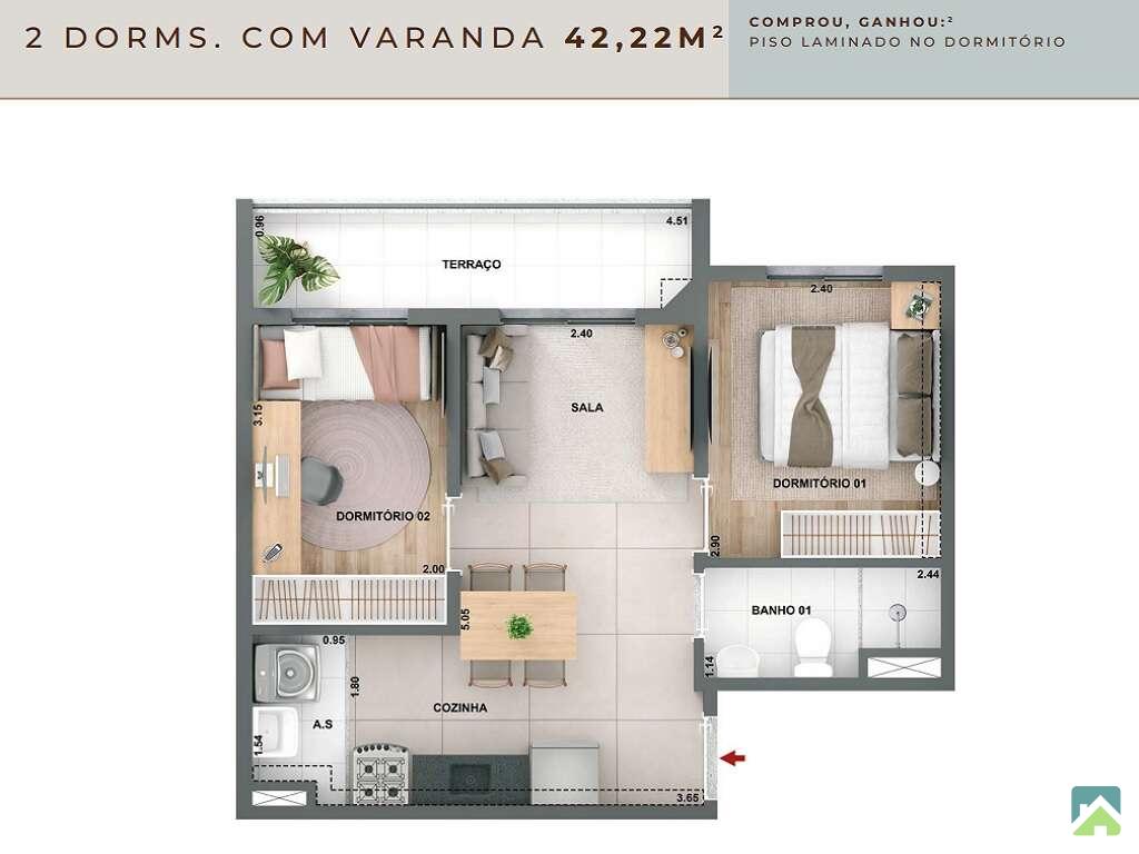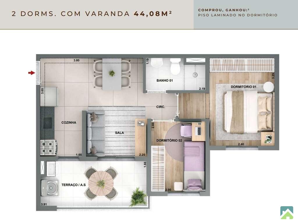 Apartamento com 2 dormitórios, sala para 2 ambientes com amplo terraço, banheiro social, cozinha com iluminação e ventilação natural e área de serviço com acesso à varanda. 44m² muito bem distribuídos. HIS2